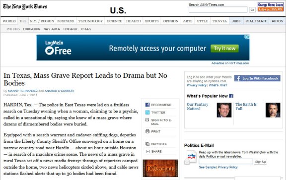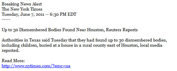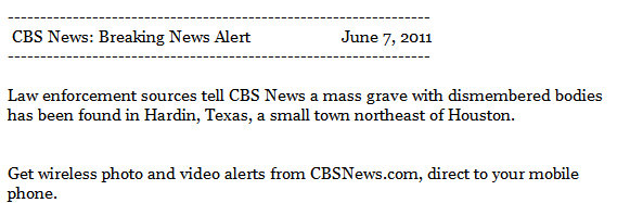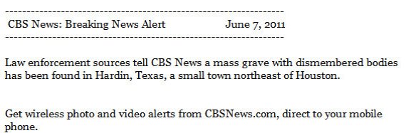 Yesterday afternoon, in quick succession, I received several news bulletins about 30 dismembered bodies that had been found buried outside Houston. The news bulletins, which I include here, came from serious news organizations, and were phrased with language implying enough certainty that I immediately forwarded the news to some colleagues at John Jay College’s Academy of Critical Incident Analysis, a research group in which I participate. Among other things, we are interested in the impact of sudden high profile catastrophic incidents on public attitudes, behavior and the larger social order.